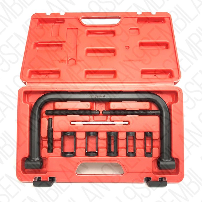 Treker Klep Set / Valve Spring Compressor Set5 Pcs Open sided adaptors- Size: 16mm (OD.) - 13.5mm (ID.)- Size: 19mm (OD.) - 16.5mm (ID.)- Size: 23mm (OD.) - 21.5mm (ID.)- Size: 25mm (OD.) - 23.5mm (ID.)- Size: 30mm (OD.) - 27.5mm (ID.)3 pcs Extension screws1 pcs Spring compressor "U" clamp1 pcs Compressio