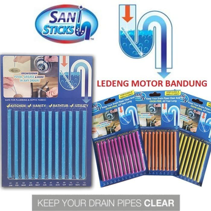 Sani Stick Drain Pembersih Pewangi Wastafel Saluran Air Mampet Toiletharga 1 pack/ pcs ya isi 12 batangWarna:- Ungu (Kosong)- Kuning (Kosong)- Orange (Kosong)- BiruSani Sticks membersihkan dan menghilangkan bau yang tidak sedap dari saluran air dan mencegah mampet.Sani Stick memiliki daya yang kuat memecahkan minyak dan lemak untuk menjaga saluran air bebas dan lancar.Sani Sticks dapat digunakan sebagai pewangi dan pembersih dengan bentuk seperti stick bulat dan panjang hanya 6,3 inci dan 100 persen aman untuk pipa dan tangki septik.#Empatsa