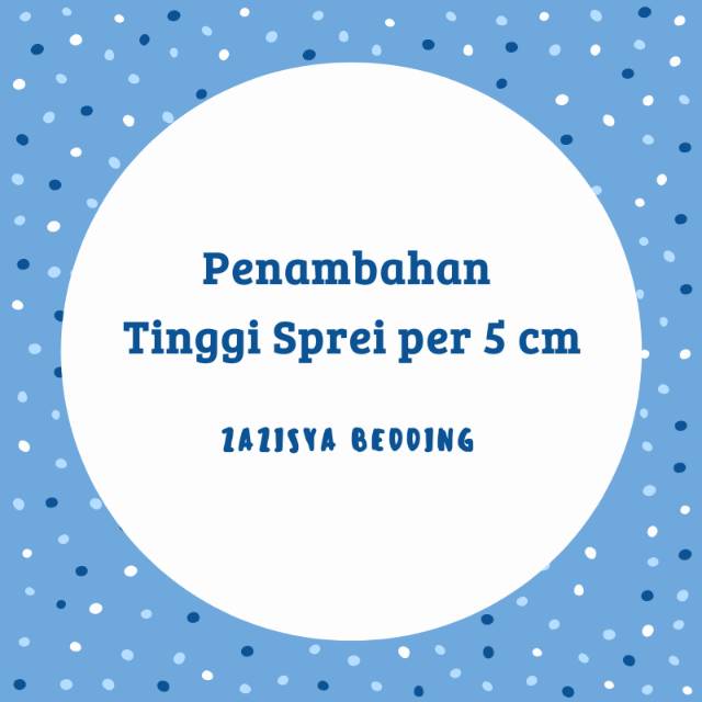 CART KHUSUS TAMBAHAN TINGGI SPREITinggi sprei standar yang kami buat adalah :- katun lokal = 20 cm (tinggi bersih 18cm)- katun jepang = 25 cm (tinggi bersih 23cm)- Tencel organik = 30 cm (tinggi bersih 28cm)- kingkoil sutra = 40cm (tinggi bersih 38cm)Jika ingin menambah tinggi lebih dari tinggi standar silakan add cart sesuai dengan bahan yg dipesan1x klik = tambah tinggi 5 cm2x klik = tambah tinggi 10cmdst...PERLU DIPERHATIKAN!!!KONSEKUENSI PENAMBAHAN TINGGI ADALAH AKAN ADA SAMBUNGAN JAHITAN SPREI DI BAGIAN KEPALA (ATAS) SPREI. HAL TERSEBUT ADALAH MUTLAK TERJADI. SEMUA TINGGI DIATAS ADALAH TINGGI KOTOR, MARGIN KEHILANGAN KARENA LIPATAN JAHITAN SEKITAR 2cmJangn ragu untuk chat admin jika ada pertanyaan yang ingin disampai